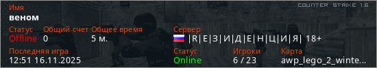Играет на Counter Strike 1.6 сервере. Страна: РоссияПервый раз замечен 12:40 16.11.2025