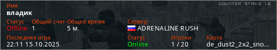 Играет на Counter Strike 1.6 сервере. Страна: РоссияПервый раз замечен 21:14 15.10.2025