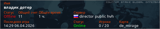 Играет на Counter Strike Global Offensive сервере. Страна: РоссияПервый раз замечен 01:39 28.03.2026