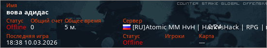 Играет на Counter Strike Global Offensive сервере. Страна: РоссияПервый раз замечен 18:32 10.03.2026