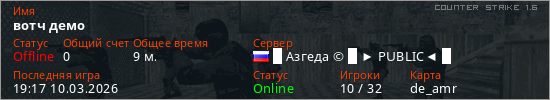 Играет на Counter Strike 1.6 сервере. Страна: РоссияПервый раз замечен 16:59 09.03.2026