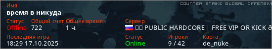 Играет на Counter Strike Global Offensive сервере. Страна: РоссияПервый раз замечен 17:41 25.09.2025