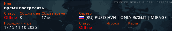 Играет на Counter Strike Global Offensive сервере. Страна: РоссияПервый раз замечен 10:48 26.09.2025