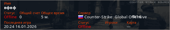 Играет на Counter Strike Source сервере. Страна: РоссияПервый раз замечен 20:18 16.01.2026