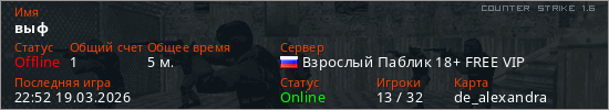 Играет на Counter Strike 1.6 сервере. Страна: РоссияПервый раз замечен 22:50 19.03.2026