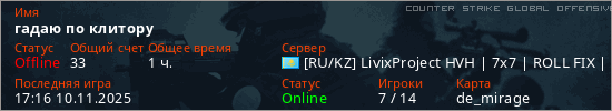 Играет на Counter Strike Global Offensive сервере. Страна: КазахстанПервый раз замечен 16:33 21.10.2025