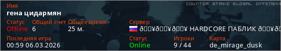 Играет на Counter Strike Global Offensive сервере. Страна: РоссияПервый раз замечен 23:06 05.02.2025
