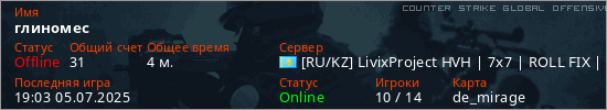 Играет на Counter Strike Global Offensive сервере. Страна: КазахстанПервый раз замечен 18:59 05.07.2025