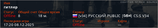 Играет на Counter Strike Source сервере. Страна: РоссияПервый раз замечен 11:06 08.12.2025