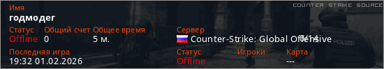 Играет на Counter Strike Source сервере. Страна: РоссияПервый раз замечен 19:29 01.02.2026