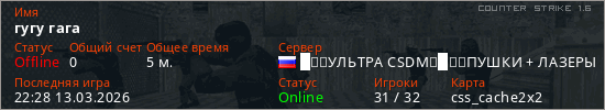 Играет на Counter Strike 1.6 сервере. Страна: РоссияПервый раз замечен 22:23 13.03.2026