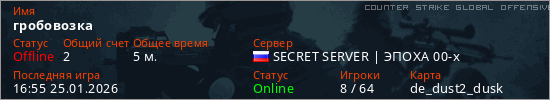 Играет на Counter Strike Global Offensive сервере. Страна: РоссияПервый раз замечен 16:53 25.01.2026