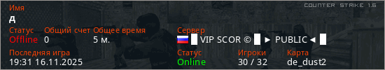 Играет на Counter Strike 1.6 сервере. Страна: РоссияПервый раз замечен 19:21 16.11.2025