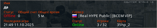 Играет на Counter Strike 1.6 сервере. Страна: РоссияПервый раз замечен 21:47 11.10.2025