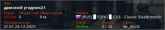 Играет на Counter Strike Source сервере. Страна: РоссияПервый раз замечен 21:10 21.12.2025