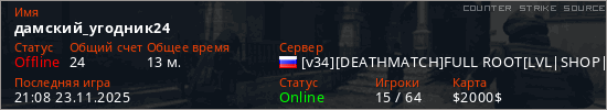 Играет на Counter Strike Source сервере. Страна: РоссияПервый раз замечен 19:03 19.11.2025