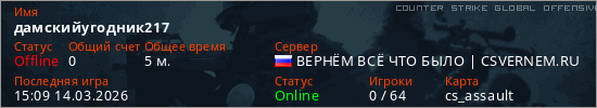 Играет на Counter Strike Global Offensive сервере. Страна: РоссияПервый раз замечен 15:03 14.03.2026