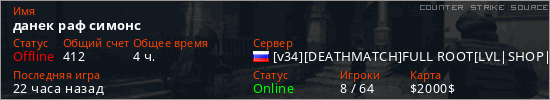 Играет на Counter Strike Source сервере. Страна: РоссияПервый раз замечен 22:41 08.02.2026