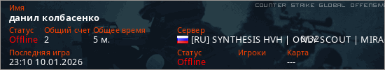 Играет на Counter Strike Global Offensive сервере. Страна: РоссияПервый раз замечен 23:02 10.01.2026