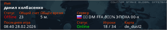 Играет на Counter Strike Global Offensive сервере. Страна: РоссияПервый раз замечен 08:31 28.02.2026