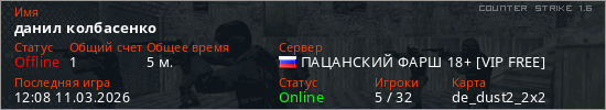 Играет на Counter Strike 1.6 сервере. Страна: РоссияПервый раз замечен 11:58 11.03.2026