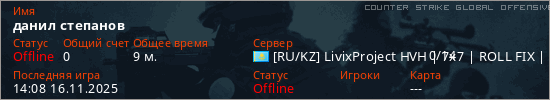 Играет на Counter Strike Global Offensive сервере. Страна: КазахстанПервый раз замечен 22:30 15.11.2025