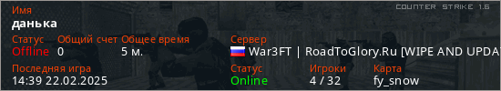 Играет на Counter Strike 1.6 сервере. Страна: РоссияПервый раз замечен 14:33 22.02.2025