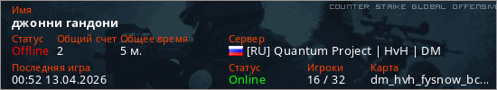 Играет на Counter Strike Global Offensive сервере. Страна: РоссияПервый раз замечен 00:50 13.04.2026