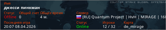 Играет на Counter Strike Global Offensive сервере. Страна: РоссияПервый раз замечен 20:05 08.04.2026