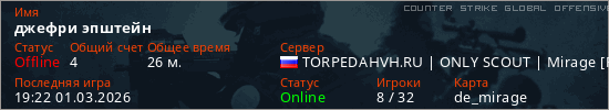 Играет на Counter Strike Global Offensive сервере. Страна: РоссияПервый раз замечен 18:59 27.02.2026