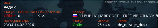 Играет на Counter Strike Global Offensive сервере. Страна: РоссияПервый раз замечен 17:48 14.02.2026