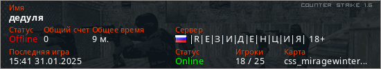 Играет на Counter Strike 1.6 сервере. Страна: РоссияПервый раз замечен 15:38 31.01.2025