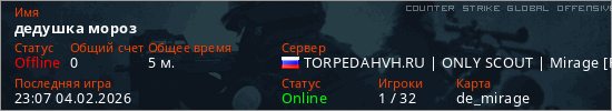 Играет на Counter Strike Global Offensive сервере. Страна: РоссияПервый раз замечен 22:55 04.02.2026