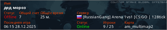 Играет на Counter Strike Global Offensive сервере. Страна: РоссияПервый раз замечен 08:55 26.12.2025