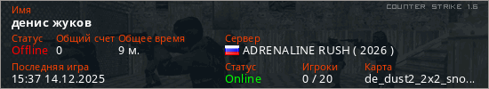 Играет на Counter Strike 1.6 сервере. Страна: РоссияПервый раз замечен 15:03 14.12.2025