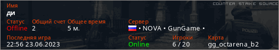 Играет на Counter Strike Source сервере. Страна: РоссияПервый раз замечен 22:54 23.06.2023