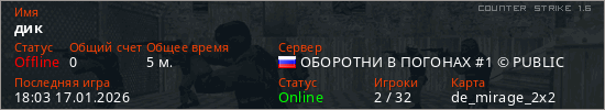 Играет на Counter Strike 1.6 сервере. Страна: РоссияПервый раз замечен 18:01 17.01.2026