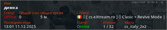 Играет на Counter Strike 1.6 сервере. Страна: РумынияПервый раз замечен 12:59 11.12.2025