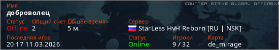 Играет на Counter Strike Global Offensive сервере. Страна: РоссияПервый раз замечен 19:56 11.03.2026