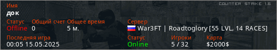 Играет на Counter Strike 1.6 сервере. Страна: РоссияПервый раз замечен 00:01 15.05.2025