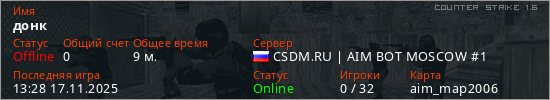 Играет на Counter Strike 1.6 сервере. Страна: РоссияПервый раз замечен 12:22 17.11.2025