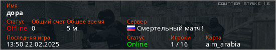 Играет на Counter Strike 1.6 сервере. Страна: РоссияПервый раз замечен 13:48 22.02.2025