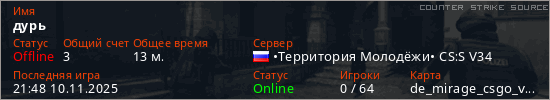 Играет на Counter Strike Source сервере. Страна: РоссияПервый раз замечен 17:55 10.11.2025