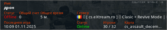 Играет на Counter Strike 1.6 сервере. Страна: РумынияПервый раз замечен 10:07 01.11.2025