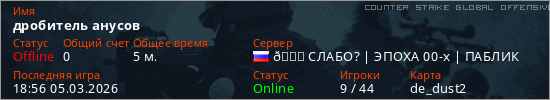 Играет на Counter Strike Global Offensive сервере. Страна: РоссияПервый раз замечен 18:43 05.03.2026
