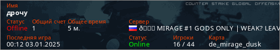 Играет на Counter Strike Global Offensive сервере. Страна: РоссияПервый раз замечен 00:04 03.01.2025