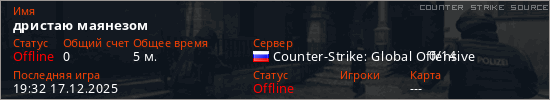 Играет на Counter Strike Source сервере. Страна: РоссияПервый раз замечен 19:14 17.12.2025