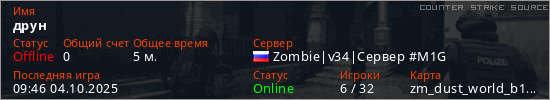 Играет на Counter Strike Source сервере. Страна: РоссияПервый раз замечен 09:44 04.10.2025