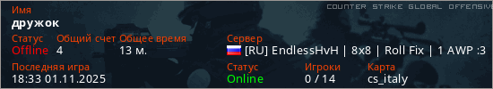 Играет на Counter Strike Global Offensive сервере. Страна: РоссияПервый раз замечен 01:56 30.10.2025