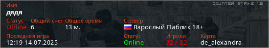 Играет на Counter Strike 1.6 сервере. Страна: РоссияПервый раз замечен 12:28 17.05.2025
